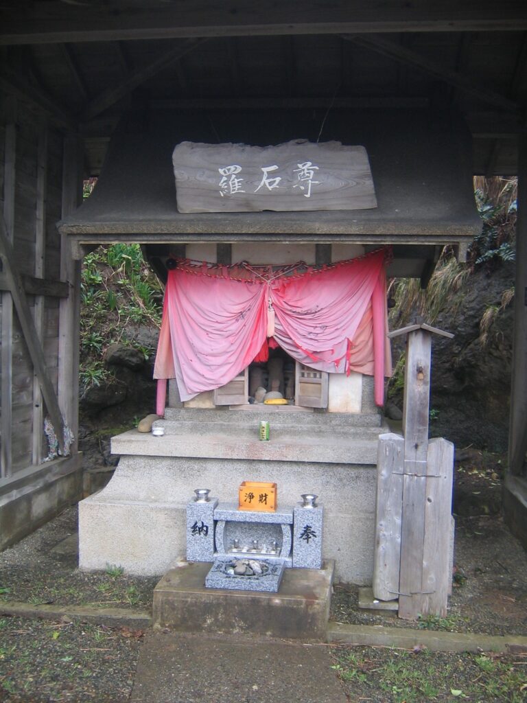 「羅石さん」として昔から、「子宝・安産・育児」などの子育て信仰をはじめ、婦人の病気、或いは良縁に恵まれるなどの信仰がなされていた。ご神体は海上にそそり立つ男根そのままの奇岩であったが、船の難破によって頭部が切断され、渚へ打ち上げられたのを祠を建てて祀ったのが始まりである。